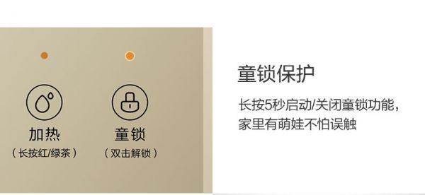 购买高效能的家居产品,可以优化我们的生活,但是如果安全性与健康性得不到保障,前期有多方便,也弥补不了后期的后悔。美的YR1808S-X茶吧机,壶内采用安全健康的304不锈钢,一体成型清洁方便,耐腐不锈;外层隔热PP塑料材质,拉丝设计手感细腻,微保温又防烫;日常生活,怕宝宝接触产品有危险?为了防止宝宝误触机器导致意外烧水烫伤,美的YR1808S-X茶吧机设置长按开关一键童锁功能,每次双击即可上锁,5s内无任何操作直接上锁,产品使用更安心。