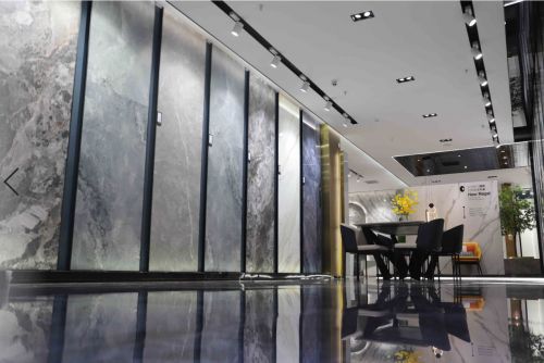 目前,新濠的岩板产品规格非常齐全,主要有600×1200mm、900×1800mm、800×2600mm的国产岩板产品,以及1200×2400mm、1200×2600mm的进口岩板产品。在岩板的应用上,新濠灵活地将岩板融入到展厅设计中;在品牌和产品定位上,依旧以大理石瓷砖品类为主;在销售上,新濠将发挥得当岩板的优势,不给经销商带来太大的负担。