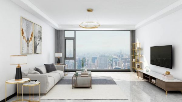 客厅装上一扇大落地窗,能时刻欣赏外面的美景。细腻深邃的灰色窗框,简约淡雅的墙面,再来点瞩目的金色软饰家居线条点缀,尽显空间格调与独特个性。