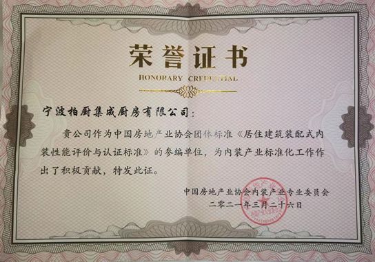 为进一步推进装配式建筑的发展,加强住宅产业化和内装工业化的研究,由中国房地产业协会内装产业专业委员会和中国建筑标准设计研究院共同牵头,行业内有实力和经验的单位共同参与协作起草《居住建筑装配式内装性能评价与认证标准》。日前,中国房地产业协会内装产业专业委员会正式向柏厨家居颁发了参编单位荣誉证书,以此表彰柏厨家居为内装产业标准化所作出的积极贡献。