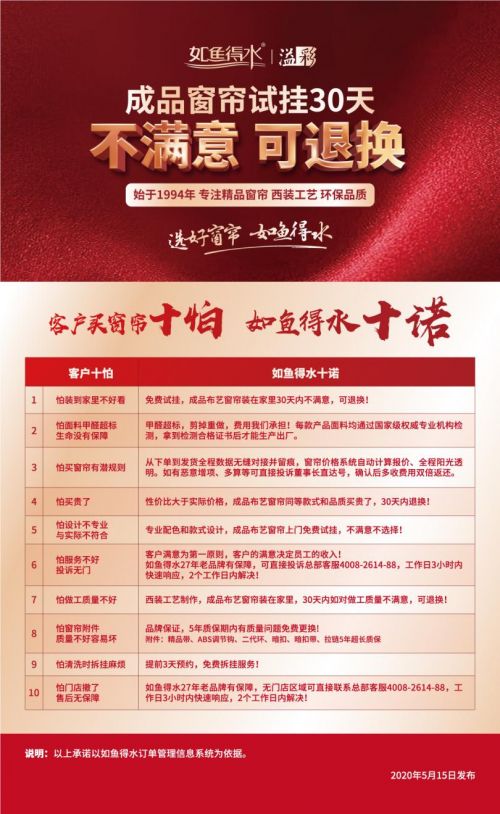 在消费者不断变挑剔、海底捞式服务不断刷屏的当下,提升服务质量已经成为终端的高频词汇,对于窗帘行业来说,光有服务是远远不够的,想要占领消费者心智还需要将服务特色化。如鱼得水充分整合产品资源,持续推出区别于传统模式的创新成品服务模式,如“十怕十诺”、成品试挂等。去年5月,如鱼得水郑重发布“客户买窗帘十怕,如鱼得水十诺” ,引发行业轰动。如鱼得水董事长表示,要把离客户更近、购买体验感更好,作为所有思考和改革创新的出发点,发自内心爱客户,解决客户购买窗帘真正的痛。在如鱼得水看来,品牌服务的持续升级,推出具有品牌特色的服务,是企业的自我革新也是行业的进步动力。未来,服务体系的不断发展与完善,也将成为如鱼得水的核心竞争力。