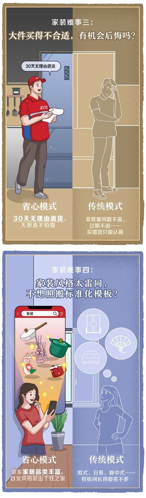 除了以上8大服务,京东居家“省心装”还包含材质验真、晚必赔、24H发货、免费上门取退、上门测量、送货上门、破损包退换、大件运费险、极速审核、闪电退款等服务,从售前、售中、售后全方位满足家装用户的个性化需求,全面攻克家装难事。都2021年了,家装何必再“迎难而上”?!抱紧这份专业“治难”宝典,放手交给京东吧!