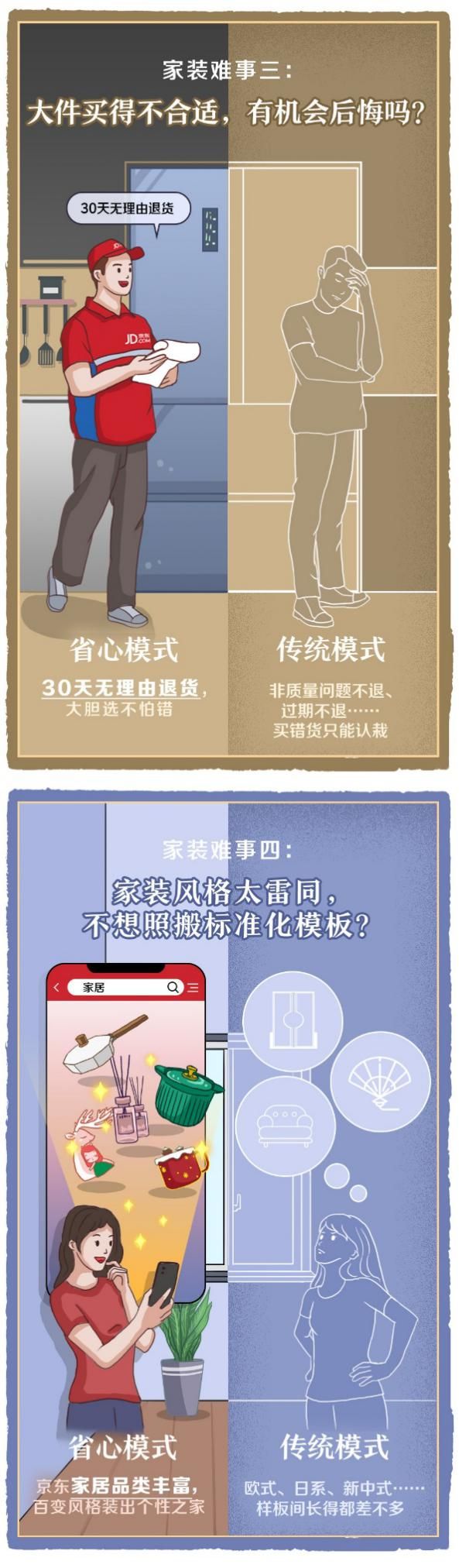 除了以上8大服务,京东居家“省心装”还包含材质验真、晚必赔、24H发货、免费上门取退、上门测量、送货上门、破损包退换、大件运费险、极速审核、闪电退款等服务,从售前、售中、售后全方位满足家装用户的个性化需求,全面攻克家装难事。都2021年了,家装何必再“迎难而上”?!抱紧这份专业“治难”宝典,放手交给京东吧!