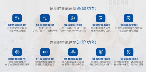 普拉眠深刻地意识到这点,在床垫软硬度调节、头尾遥控升降、睡眠实时检测、智能睡眠管理等基础功能之上,进阶出了腰颈牵引理疗、分段软硬调节、语音随叫服务、缓解轻度打鼾、自动叫醒服务的五大功能,让智能床垫得到不一样的蜕变。