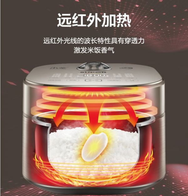 在加热方式上,苏泊尔远红外电饭煲采用了苏泊尔第六代革命性加热方式——远红外穿透加热技术,让每一粒米都可以达到黄金含水率,均匀受热,焕活米芯,让煮出的米饭饭香四溢;通过电磁共振效应,产生103度的高温,促进米饭熟化,提升米饭还原糖含量,让米饭吃起来更加甜美。