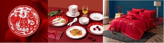 博物文创喜字贴(左)、摩登主妇陶瓷碗盘(中)、罗莱家纺嫁娶四件套(右)