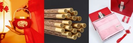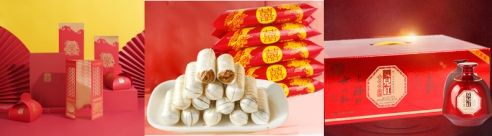 故宫文化龙凤迎喜请柬(左)、马大姐传统手工大喜酥(中)、女儿红绍兴黄酒(右)