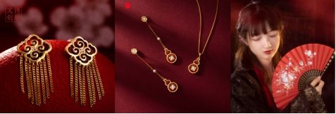 而作为国风婚礼的女主角,新娘的装扮是绝对的焦点,红色玛瑙耳饰、项链、趁手的装饰可以装点新娘的国风韵味。博物文创四合如意云纹玛瑙耳饰,如意云头灵动饱满,条条流苏金光摇曳,红金相映衬得新娘古典吉庆好气质;福禄大吉玛瑙项链,晶莹“葫芦”寓意福禄,让新娘顾盼生辉,吸引所有人的目光;喜鹊对鸣花鸟图红色折扇,仿真丝扇面轻盈送风,繁花盛开喜鹊对鸣图案绘制,凸显喜悦与国风浪漫。