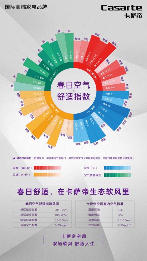 对此,中国气象爱好者联合卡萨帝空调发布了“春日舒适空气指数”,在从温、湿、净、风4个维度,对杭州、海口、扬州、厦门等10座春日宜居城市空气进行分析后,发现再完美的春日限定空气,也总有不舒适的成分,真正集温、湿、净、风于一体的舒适空气只在卡萨帝空调的生态软风里。