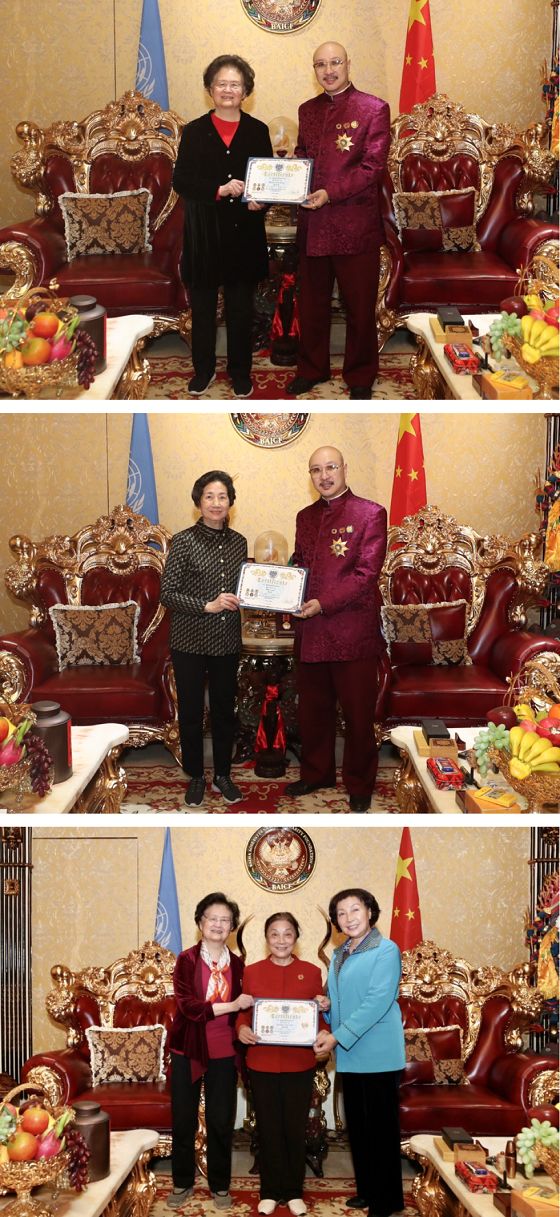 图16|深圳市政协原党组副书记兼常务副主席邵汉青(左)与深圳侨联名誉主席孔爱玲(右)代表国际标量波量子研究院隆重聘请深圳市人大常委会党组成员胡利群(中)为该院高级特邀研究员