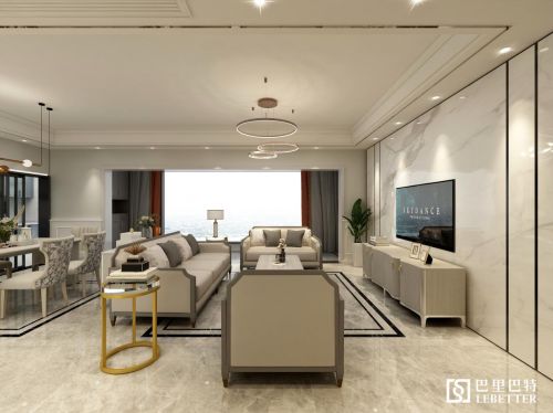本案例中,设计师在空间线条上采用了现代装饰线条,力求简约,但同时表达的却是美式古典情怀。因此可以看到居室里带有古典气息的外观造型,但线条简约的家具和艺术品。同时以灰色、褐色、白色等作为空间基础色调,加以橙色、黄色、金色等点缀,带来轻奢、活力视感。