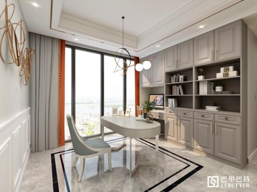 如何提高工作、学习效率?关键在于创造一个舒适精致的空间环境。美式实木书桌与实木书柜的搭配,带来自然与随性的格调。清新舒适的蓝灰色书椅,成为活泼的点缀。明亮的色调,让人精神焕发,即便不能让你灵感迸发,至少轻松惬意。