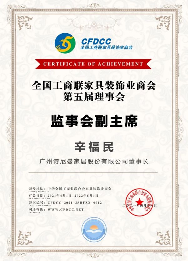 祝贺诗尼曼家居董事长辛福民荣膺全国工商联家具装饰业商会监事会副主席