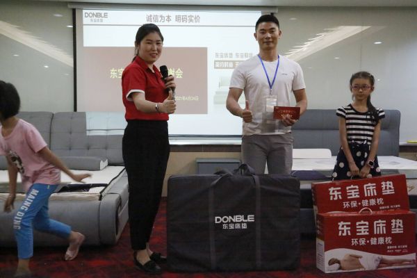现场,东莞大区经理许湛美上台为大家介绍如何挑选合适的床垫和床架,还现场邀请了客户嘉宾上台亲自试躺体验。展厅金牌睡眠顾问上台为大家讲解,如何挑选优质的乳胶枕头,并邀请了两位小朋友上台体验。