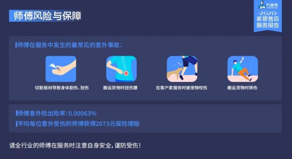 家居师傅上门服务涉及到搬运和安装,需要使用工具利器,每一笔订单处于不同的工作环境中,难免发生意外情况。师傅接单时主动购买意外保险,在意外受伤后可获取保险理赔。2020年师傅意外险的出险率为0.00063%,即上门服务的15万人/次中,有1人/次受伤,受伤概率低,但家居师傅仍需小心谨慎。