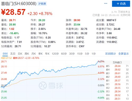 截止4月23日收盘,喜临门股价飙涨至28.57元/股,单日涨幅8.76%,总市值110.69亿元,创公司上市以来新高。
