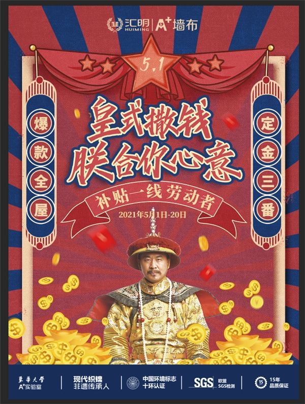 “五一”小长假即将来临,景区难排队?车票买不到?不如来汇明A+墙布,薅品牌羊毛。汇明A+墙布为回馈广大消费者多年来的支持与信赖,在5月1日-20日准备了四重好礼福利---“皇室撒钱·朕合你心意”!