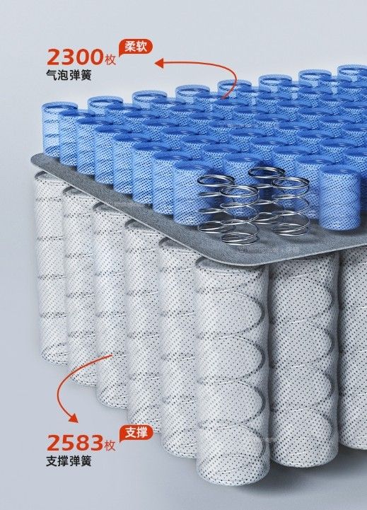 西屋床垫S3,是首个拥有4883枚独立袋装弹簧的高端床垫品牌。众所周知,行业上的高端床垫在同等价位的基础上,最多配置800-1000枚左右的弹簧数量,而西屋床垫S3,4883枚的配置是由2300枚气泡弹簧和2583枚独立袋装支撑弹簧组成,一方面实现柔软缓压的效果,另一方面提供强力支撑着人体脊椎,这种配置正如像素点系统,像素点越小,则缝隙越小,支撑效果越强大。同时能够自动感应识别人体部位曲线,更好的与脊椎相贴合,能够保证脊椎的自然弯曲,将人体重量的压力均匀分散在每一个弹簧上,保证舒适睡觉姿势,大大减少翻身次数。