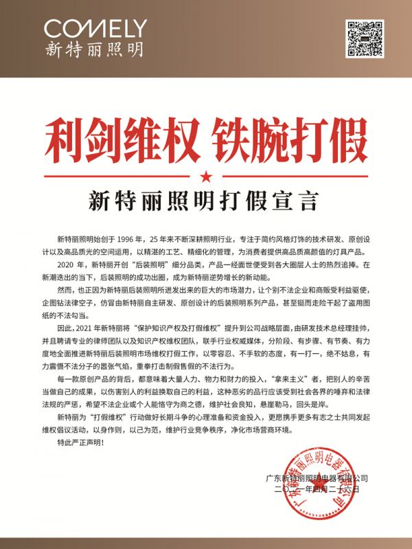 据了解,新特丽过去25年始终坚持现代灯饰的原创设计,始终走在行业的前端,在2020年再一次引领行业发展,开创了“后装照明”这一细分品类,自去年正式走上市场,短短不到一年的时间,创新举措获得了市场的热烈反响,并且取得了不俗的成绩。此举,自然也吸引了不少“想走捷径”的企业商家,想通过“仿冒”来实现财富。
