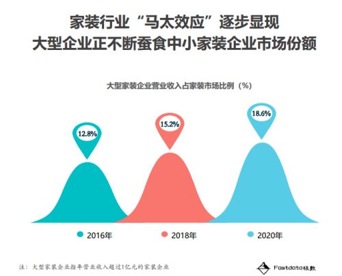 从行业竞争角度来看,家装企业“马太效应”初步显现,报告指出,大型装企正在不断蚕食中小家装企业的市场份额,2020年亿元产值以上装企市场份额已达18.6%。尤其当行业进入存量博弈时代,行业的竞争更为白热化,中小家装企业由于品牌影响力几近于无、数字化能力微弱、长期处于低水平同质化竞争,面临着被市场淘汰的风险。