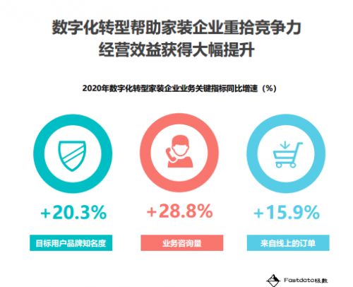 数据表明,数字化转型对装企经营效益的提升是显而易见的,2020年,数字化转型装企的业务咨询量同比增长28.8%,目标用户品牌知名度同比增长20.3%,线上订单同比增长15.9%。