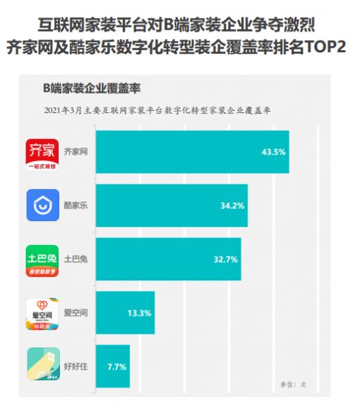 值得注意的是,在众多互联网家装平台中,齐家网平台上数字化转型装企的覆盖率高达43.5%,居行业TOP1,酷家乐、土巴兔位于TOP2及TOP3,也就是说,在探索数字化转型的所有家装企业中,有43.5%选择了与齐家网合作。