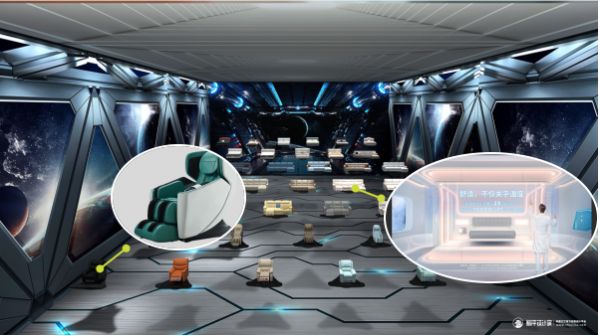 另外每个展厅都有对应的芝华仕系列家居产品陈列,点击产品就能连接到相关产品的详情页,同时还结合不同的家庭生活场景,设置了符合情侣家庭生活模式的按摩椅休息区,单身家庭生活模式的单椅影音区和适合三代同堂的不同家居风格的芝华仕全套家居组合展示区,在按摩椅休息区,设计师别出心裁地打造了情侣逛街完了之后,回家躺在按摩椅上休息的生活场景;而单椅影音区则利用芝华仕单椅功能沙发与墙面投屏相结合,营造出了充分自我享受的家庭影院的感觉。