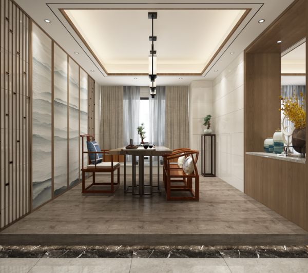 一茶一世界,一味一人生。深灰色木地板,清新素雅,棕色的木质圈椅和灰色岩板茶桌,安静泰然,背后的山水画,细心染墨,无需多余点缀,吊顶凹位造型代表聚水的天池,具有聚揽好运的寓意。添置的零星摆件,不必刻意雕琢,世间万物已于超然之中。