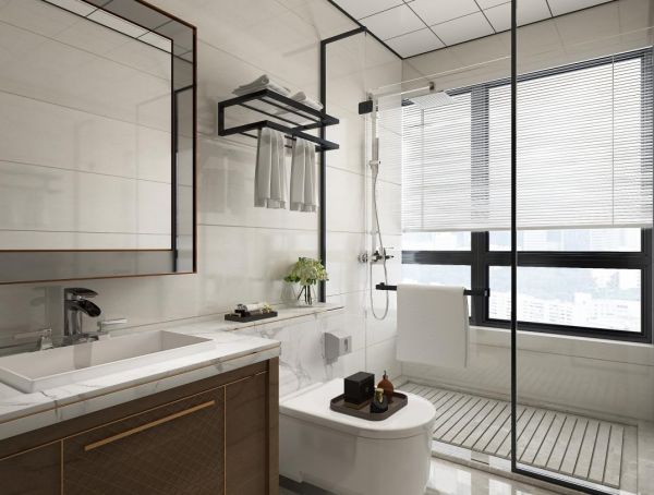 奶白色的瓷砖铺满了整个淋浴间,底下铺满防滑瓷砖,简约方便的玻璃平拉门让卫生间轻松做好干湿分离,简直满满的安全感。隐藏式的壁挂马桶浮空设计让空间留白,浴室镜柜不仅将收纳和梳妆功能集于一身,无形中又扩大了空间!