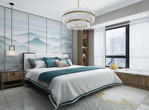 主卧主色调为孔雀蓝,它是中国瓷器釉色之一,有着明媚的质感。丝质与绒质混搭的床品凸显着尊贵沉静,水墨画背景墙和简约的中式地毯,又为空间增添了几分生气。镶嵌着古铜色线条的高档水晶吊灯,点缀出了满满的现代感,但整体依然和谐有格调。