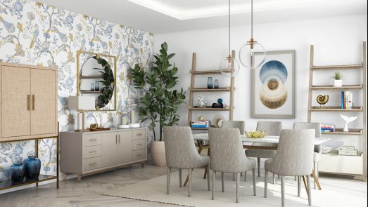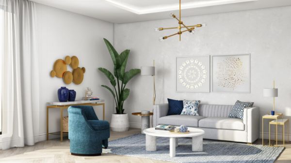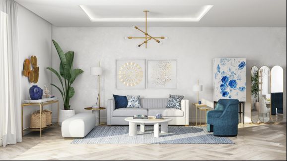 浅白色主调的空间只要增添金色摆设,便能点缀空间,和增添空间感。 以深蓝色的Roxy 椅子作为空间的重点,配衬以花卉为元素的Forever Blue 储物柜,剪纸挂画以及 Chintz 绒球饰边靠垫套,烘托出宛如大自然中的平静惬意气息。