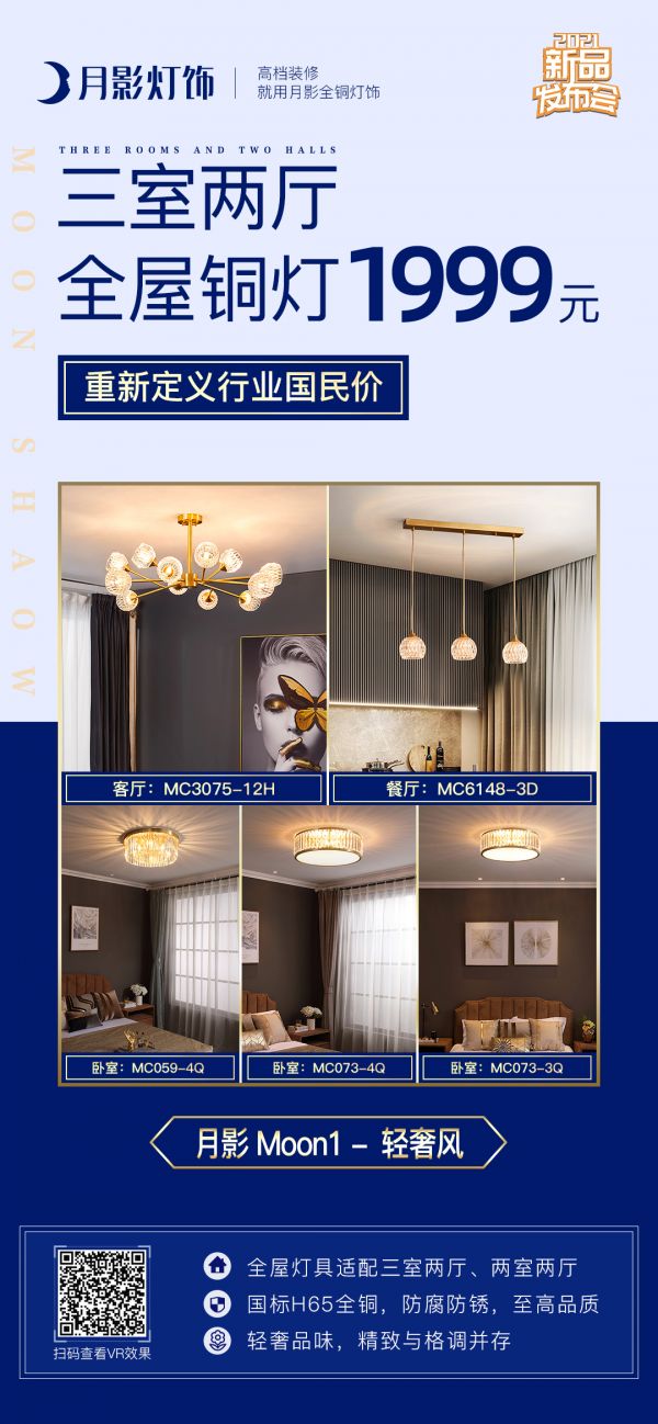 月影家居作为全铜灯饰全国销量第一的品牌,为消费者带来极具性价比的1999全屋套餐,1999全屋套餐中的灯具全部甄选国标H65全铜材质,抗锈耐腐,耐用五十年。在售后服务方面,月影家居开创超长的十年质保以及90天无理由退货的承诺,售后有保证,让消费者用得更安心。新时代用新品,月影家居1999元全屋灯饰套餐,是今年3月份在上海新品发布会上重磅推出的装饰照明精品套餐,是妥妥的潮流之选。