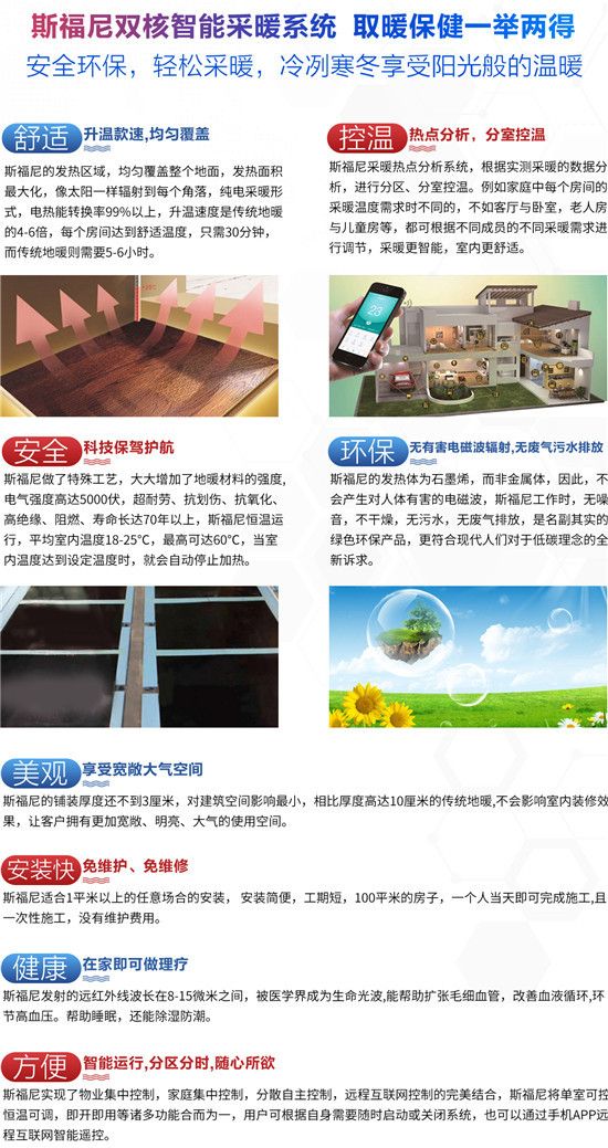 除了斯福尼供暖系统具有无污染、更节能的优点在,它还具有零维护,不用担心维修问题,它在使用的过程中可以达到70年以上的寿命,让你使用的更加方便、灵活。在安装时不需要太大的空间,一人当天即可完成施工。且一次性施工,没有维护费用,让你真正体验到科技发展带来的便利,斯福尼供暖带给你的美好生活。