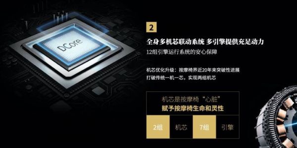选择按摩椅的第二个重点就是看机芯,市面上大部分采用2D或者3D机芯,D是指按摩空间的概念,相当于三维立体的说法。而现在有些商家称自己产品是4D机芯,其实根本不是,4D空间目前对科学家都是个迷。回到正题,机芯的质量也直接关乎着按摩椅的使用寿命,所以选择拥有高品质机芯的按摩椅绝不会出错,像DCore这类优秀的按摩椅,就配备了7组高品质,自主研发的新一代机芯:深层活力芯指机芯,是在3D的机芯上做出突破,呈现仿真人手拇指肚的按摩手法机芯, 按摩效果与质量都是出类拔萃的。