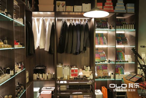 剧中美妆博主蒋博的衣帽间颜值也很高,这款衣帽间来自伯尔尼,它在风格上将科技感和轻奢感融为一体,通过木质纹理的柜面和柔和的灯光,让空间充满精致感。经典的U型式布局将墙面空间全部利用起来,让几十架美妆产品都能妥帖收纳。