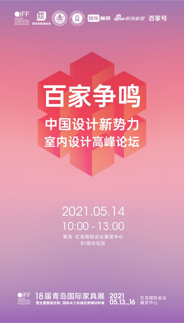 红岛相约,百家争鸣,18届青岛国际家具展期间,首届中国设计新势力室内设计高峰论坛将于2021年5月14日上午10:00-13:00在青岛红岛国际会议展览中心B1馆论坛区举行。