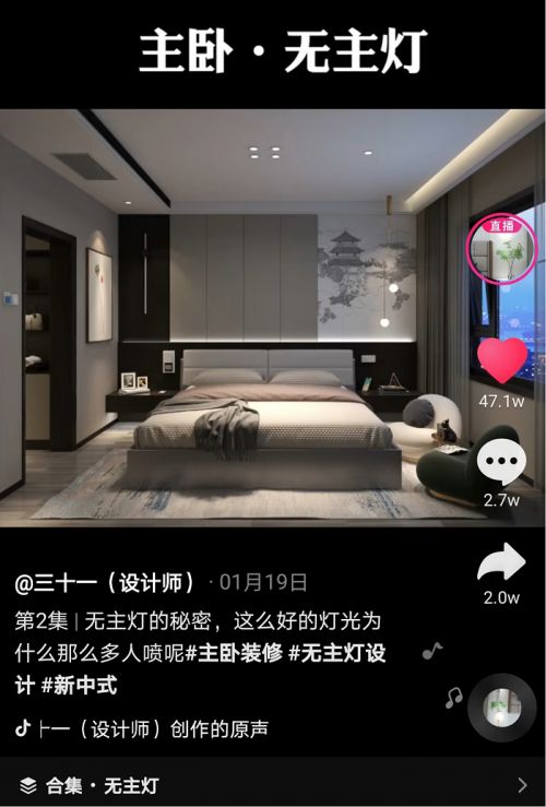 早在2018年,他曾尝试把酷家乐全景图转成视频,然后发布在视频渠道上做展示。如今,酷家乐视频解决方案推出后,他不必再曲线迂回,一个应用就手到视频来。在使用酷家乐渲染视频2个月后,高健的粉丝从3000涨到20万,其中一个作品达到300多万阅读量。