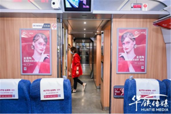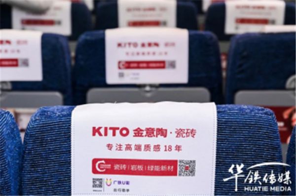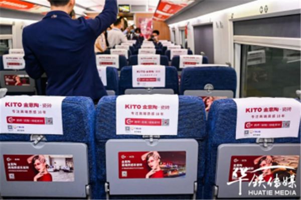 金意陶此次投放的列车全媒体将穿梭在全国各地高铁站中成为最靓丽的品牌风景线,从进入车门到落座,全方位多视觉的布局,重复性实现吸引,不断深化品牌形象。通过头枕巾、小桌板、车身贴、品牌天幕、LED显示屏、车门贴、海报等,乘客们仿佛置身于金意陶品牌专属传播空间。高铁乘客巨大的流动性,势必会为高铁车厢内的金意陶品牌宣传带来更广阔的影响力。
