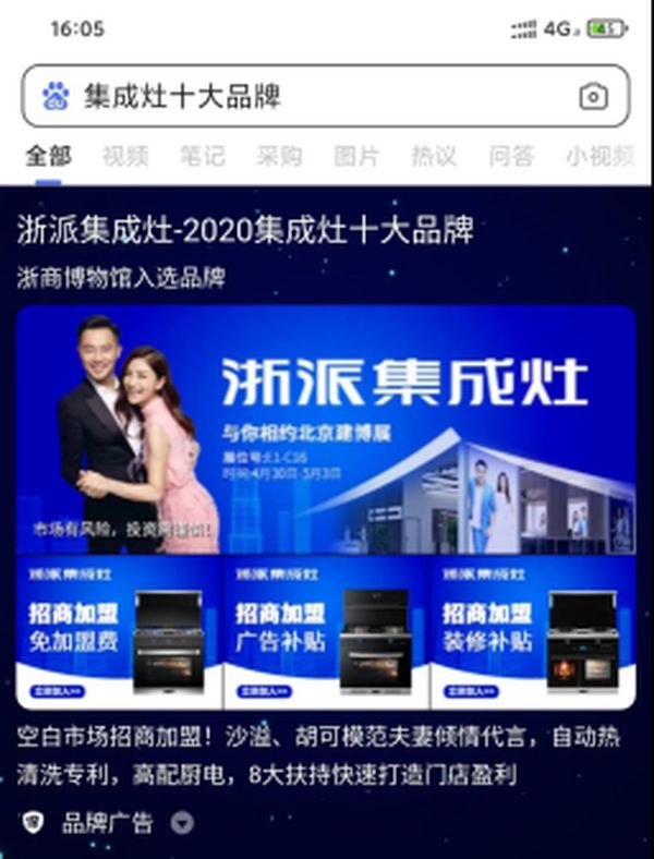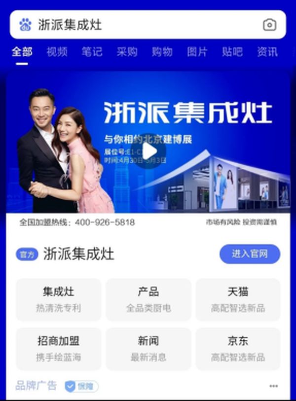 对浙派集成灶来说,本次强势入驻百度品牌专区,是继央视广告、机场广告、高铁列车广告、高炮广告之后的又一大动作。借此次百度霸屏推广,为浙派集成灶参展北京建博会做了强有力的宣传支撑!