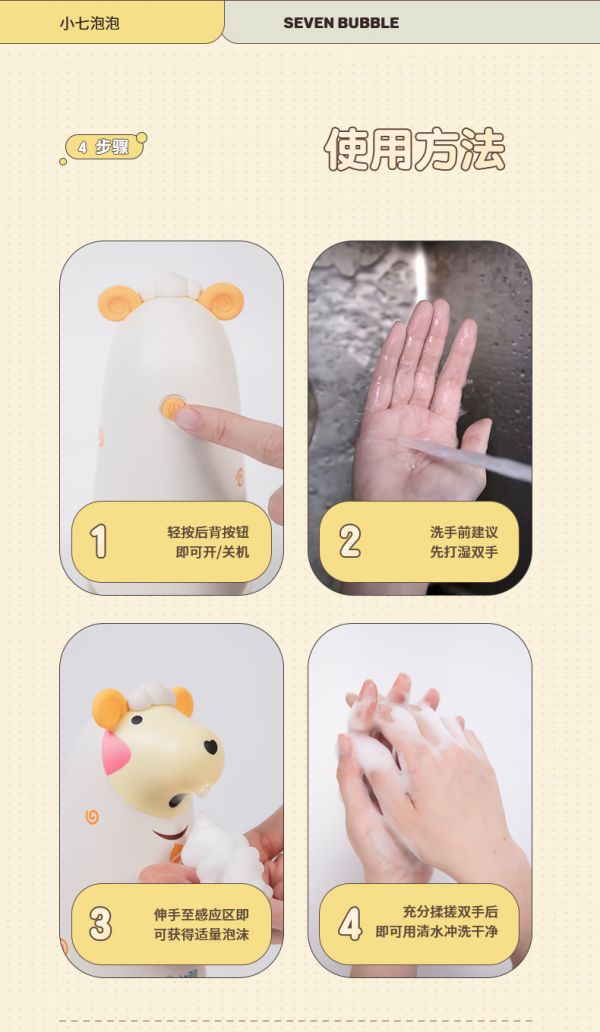 小七泡泡“庄园款”自动感应泡沫洗手机,有3款不同造型,分别是“小绵羊”、“独角兽”、“小奶牛”,每一款造型都充满童趣和萌感,无论是成年人还是孩子都能一眼爱上它。孩子力气普遍比较小,按压传统洗手机会比较吃力,从意识上阻碍了孩子勤洗手的习惯养成,换成小七泡泡庄园款洗手机,就不存在这一问题了,0.25秒红外线自动感应出泡,只要将小手伸到洗手机前面,洗手机就会自动吐出丰富细腻的泡沫,每次定量的泡沫刚好够1次洗手,非常方便。无需碰触洗手机,拒绝交叉感染。洗手时10秒呼吸灯搓泡提醒自动开启,一闪一闪陪伴孩子把小手洗干净,种种“小心思”就是为了增加孩子对洗手的兴趣和好感,从而让孩子从意识上真正喜爱洗手,养成好习惯,家长们也可以“偷着乐”。
