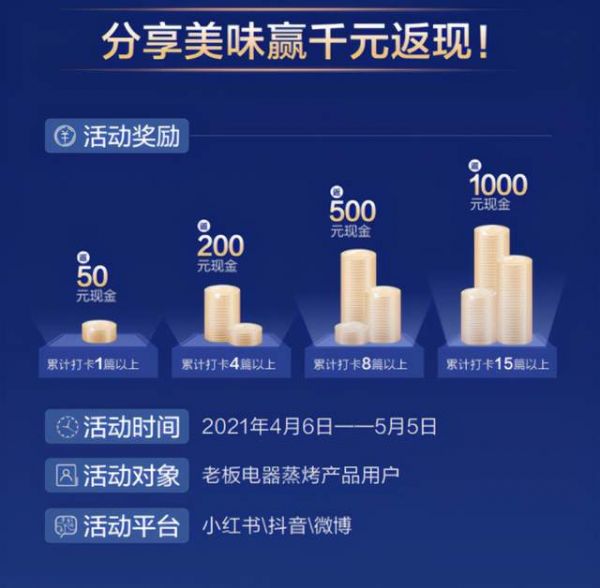 此次“蒸烤美味合伙人——百万招募计划”,面向购买过蒸烤一体机系列的用户们,通过围绕产品开箱、家庭聚会、美食烘焙等创意主题,分享日常烹饪蒸食和烤食的美味乐趣、创意菜品以及产品的使用感受,并以6张照片合集打卡或是45S以上的视频形式上传小红书、抖音、微博,作品一经采纳就能获得一系列丰厚奖励,根据创作数量以此叠加赢取千元返现。此外,还会根据创作内容评选100位优质创作者瓜分百万现金大奖,晒出优质食谱则有机会和10大美食编辑共创老板电器《本味人生》用户生活书,使更多用户感受到老板蒸烤一体机的产品魅力和烹饪乐趣。