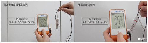 可以看出,使用日立温湿双控内机除湿的房间内温度25.5℃、湿度50.1%,已经达到了设定湿度值,而使用除湿机除湿的房间内温度26.7℃、湿度61.7%,为了对比效果,艾肯网评测团队继续让除湿机运行,60分钟后再次进行测试,结果显示,使用日立温湿双控内机除湿的房间温湿度相对稳定,温湿度分别为25.6℃、46.7%,而使用除湿机进行除湿的房间的空气湿度下降较为缓慢,温湿度分别为27.0℃、60.7%,依然没有达到设定的50%湿度值。