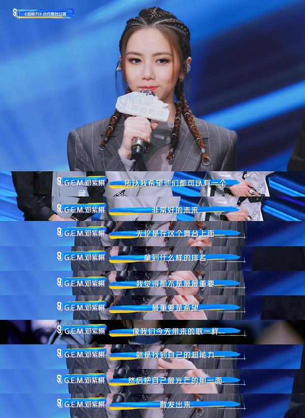 X导师GEM邓紫棋,则带领“月亮骑士”姜京佐、李钦、邱丹枫 、王南钧、汪佳辰、梓渝带来合作舞台《超能力》。邓紫棋的超强高音,彩排与现场完全听不出差别,超强气场slay全场!整首歌的动感曲风搭配biubiubiu的舞蹈简直太可爱啦,让人忍不住想要跟着一起唱跳。而她台上是气场超强的Queen,台下就是暖心的姐姐,为训练生们加油鼓劲,希望他们可以像歌里唱的那样,发挥超能力,把自己光芒四射的那一面展现出来!