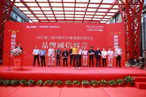 在现场嘉宾和消费者的见证下,湖南省政协常委、长沙市政协副主席、市工商联副主席、市总商会会长彭继球;中国建筑材料流通协会会长秦占学;望城经开区党工委委员、管委会副主任肖逸;中国灯饰报总编、中山市中亚照明设计研究院院长欧元春;大汉集团董事长、大汉国际工匠院创始人傅胜龙;湖南省家具行业协会执行会长兼秘书长刘发刚;湖南省室内装饰协会会长李金龙;湖南卫视《乡村发现》、《兵哥新发现》节目主持人李兵共同为2021第二届中国(长沙)家居建材博览会暨“欢购望城,相约直播”国家级望城经开区市场群第四届欢购节按下启动手印。随后,长沙市家居协会秘书长袁文和带领大汉金桥家居建材市场集群十三大品牌总裁进行品牌诚信宣言。