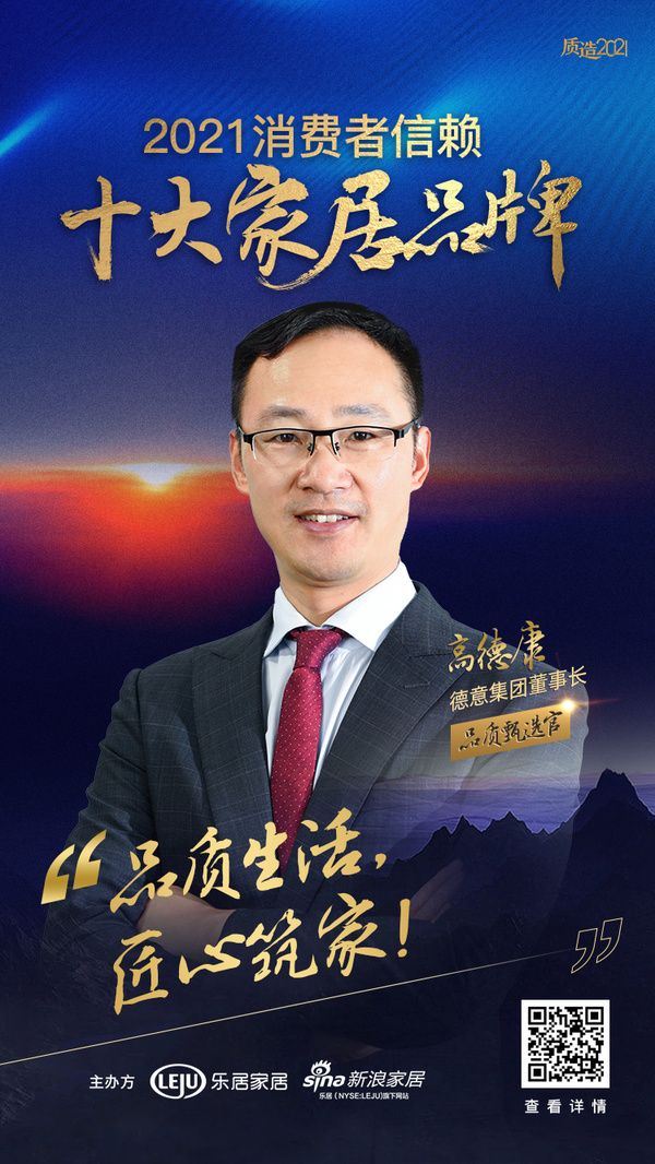 “品质生活,匠心筑家”——德意集团董事长高德康担任「2021消费者信赖十大家居品牌-品类30强评选」活动特邀「品质甄选官」,以标杆企业代表的榜样力量传递品质精神,助力国人品质消费!为品质家居代言,为中国质造背书!