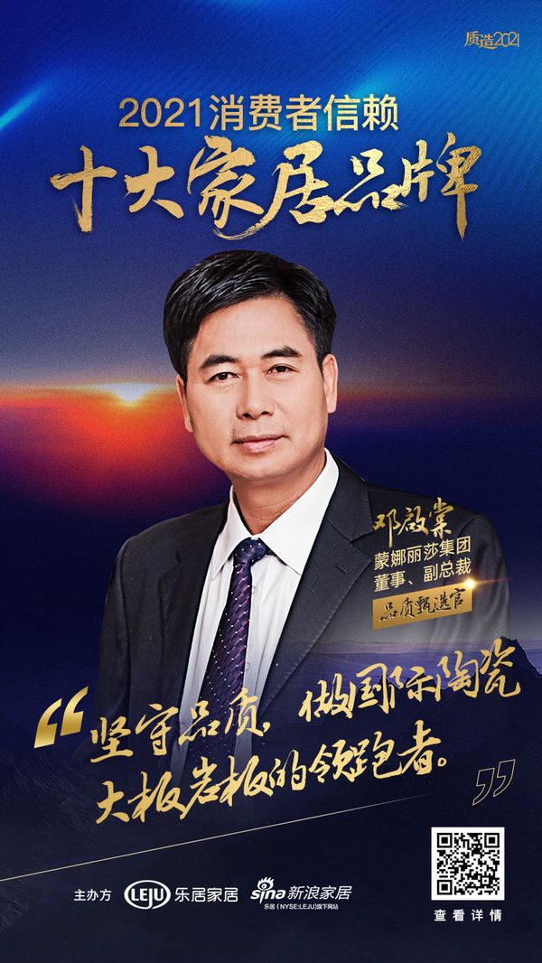 “坚守品质,做国际陶瓷大板岩板的领跑者。”——蒙娜丽莎集团董事、副总裁邓啟棠担任「2021消费者信赖十大家居品牌-品类30强评选」活动特邀「品质甄选官」,以标杆企业代表的榜样力量传递品质精神,助力国人品质消费!为品质家居代言,为中国质造背书!