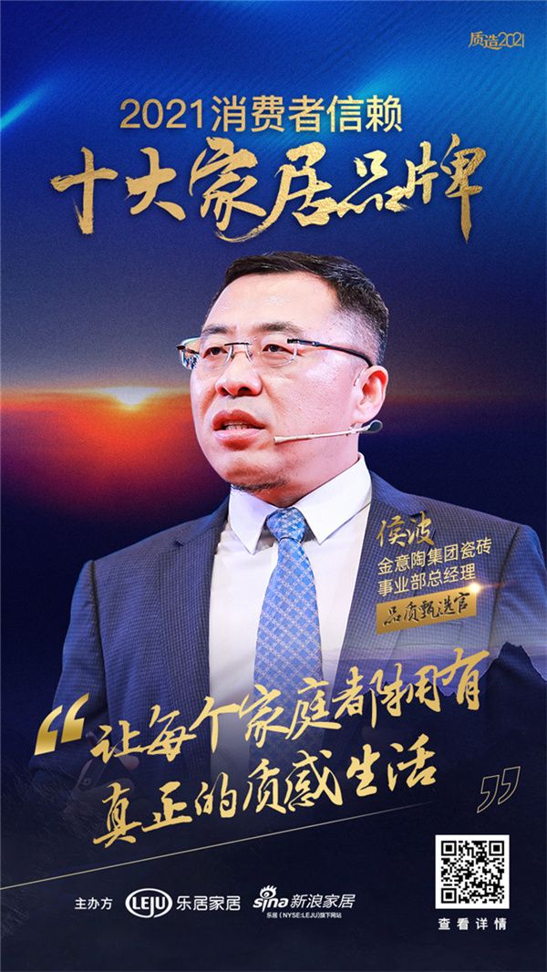 “让每个家庭都拥有真正的质感生活。”——金意陶集团瓷砖事业部总经理侯波担任「2021消费者信赖十大家居品牌-品类30强评选」活动特邀「品质甄选官」,以标杆企业代表的榜样力量传递品质精神,助力国人品质消费!为品质家居代言,为中国质造背书!