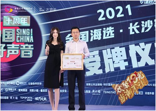 在本次半决赛活动中,长沙世纪金源购物中心物管总监-李杰先生接受2021《中国好声音》湖南、海南赛区区域总监-义小玲女士的半决赛专场冠名授牌。