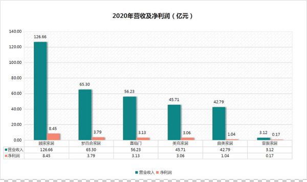 对比6大上市家具企业2020年年报来看,顾家家居仍然先拔头筹。2020年实现收入126.7亿元,同比增长14.2%,归母净利润8.45亿元,同比下滑27.19%。据悉,是由于2018年收购的几个标的运营不善,2020年商誉减值4.8亿元,故而利润同比下滑。