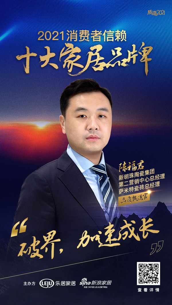 “破界,加速成长。”——萨米特瓷砖总经理陈福君担任「2021消费者信赖十大家居品牌-品类30强评选」活动特邀「品质甄选官」,以标杆企业代表的榜样力量传递品质精神,助力国人品质消费!为品质家居代言,为中国质造背书!